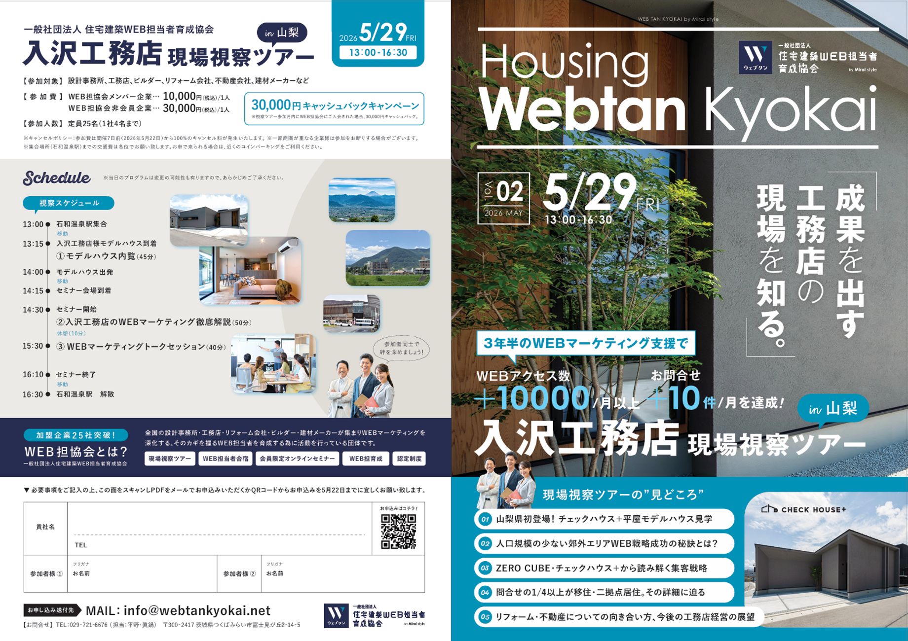 現場での実物の住宅見学から、WEB運用から来場までの顧客体験(UX/CX)のご紹介、更に後半のセミナーではWEB担当者の学びに特化した内容を予定しています。
